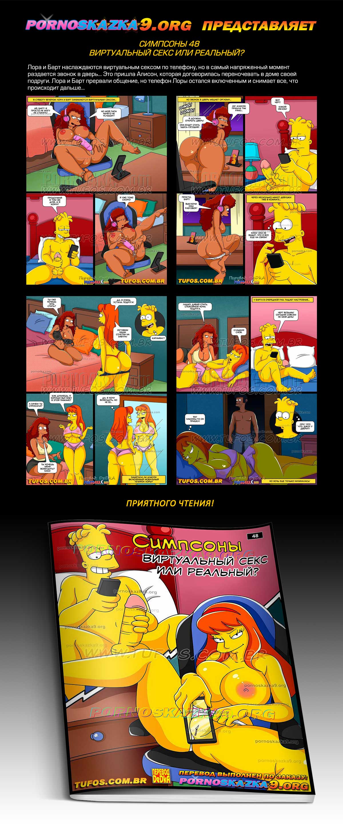 Порно комикс «Симпсоны. Часть 48. Виртуальный секс или реальный?» Лора и Барт наслаждаются виртуальным сексом по телефону, но в самый напряженный момент раздается звонок в дверь… Это пришла Алисон, которая договорилась переночевать в доме своей подруги. Лора и Барт прервали общение, но телефон Лоры остался включенным и снимает все, что происходит дальше…